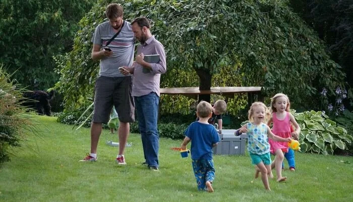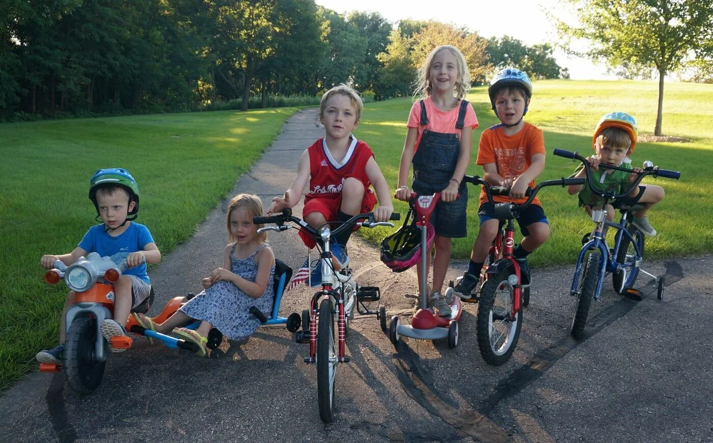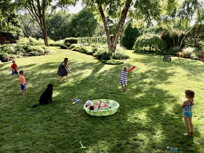 Our six grandkids have made tremendous use of the yard and gardens. Here in 2014, they play softball, climb in the tree fort, and race around paths in the community area.